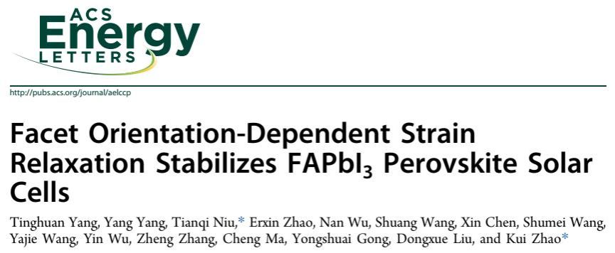 该工作揭示了钙钛矿薄膜的晶面取向、残余应力与结晶动力学之间的紧密联系,为开发高效稳定钙钛矿太阳电池的开发提供了重要的理论指导和实验依据。相关研究成果以“Facet Orientation-Dependent Strain Relaxation Stabilizes FAPbI3 Perovskite Solar Cells”为题,发表于知名材料类期刊《ACS Energy Letters》上。