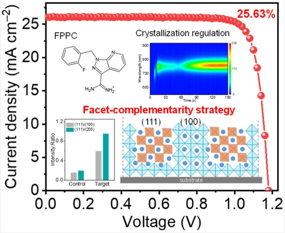 近日,公司赵奎教授团队提出了一种创新的晶面互补策略,旨在缓解FAPbI3钙钛矿薄膜中的残余应力。该策略通过向体相薄膜内引入脒基添加剂—1-(2-氟苄基)-1H-吡唑并[3,4-b]吡啶-3-甲酰亚胺盐酸盐(FPPC),有效调节了钙钛矿的结晶取向,从而改善了器件的光伏性能。研究团队发现:FPPC配体通过化学吸附于铅卤八面体晶格,降低了钙钛矿在(111)晶面上的表面能,促进了结构更为稳定的(111)晶面的形成,部分替代了原有的(100)取向,并在FAPbI3薄膜中实现(111)与(100)晶面的互补,显著降低了因过度单一取向晶面导致的应力残留。此外,FPPC配体与PbI2的配位键合可起到调节钙钛矿结晶生长的作用,拓宽了晶体生长窗口,促进更为有序的晶格重排,有效平衡了从体相到表面的结晶速率,实现了沿垂直于衬底方向上晶体的均质化生长。基于此优化策略,团队基于0.09 cm2和1.0 cm2尺寸电池上分别实现了25.63%和24.26%的高效率,同时显著提升了器件在光照及湿度条件下的稳定性。